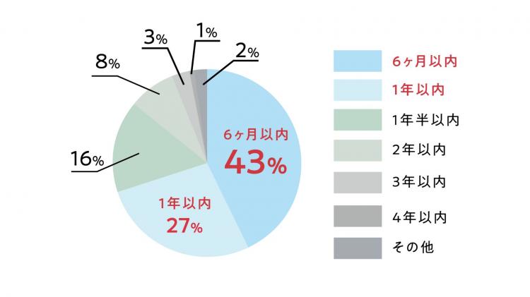 また、成人矯正も1000人を超える実績を活かし、できるだけ短期間で治療が終わるように工夫を重ねています。5年間の実績では成人矯正の70%が1年以内に、43%が半年以内に矯正完了しています。(2019年1月〜2023年12月集計)